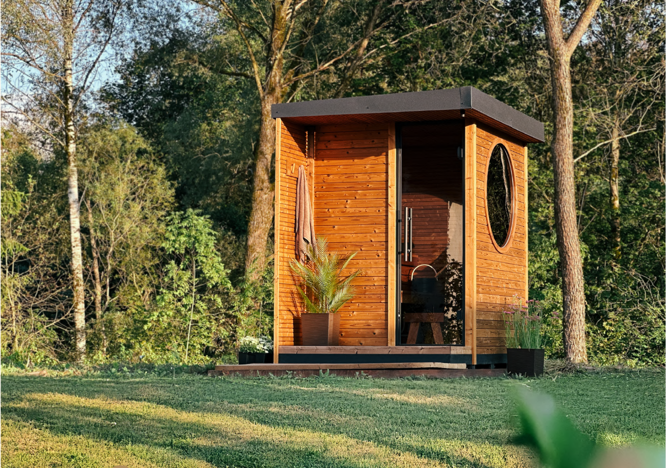 Sa fenêtre circulaire Enso, inspirée de la philosophie Zen, apporte lumière naturelle et intimité, tandis que son bardage moderne et ses matériaux de qualité – bois traité thermiquement et toit en métal durable – garantissent robustesse et longévité. L’éclairage LED intégré crée une ambiance chaleureuse, et son chauffage efficace permet une montée en température rapide pour un confort optimal toute l’année.